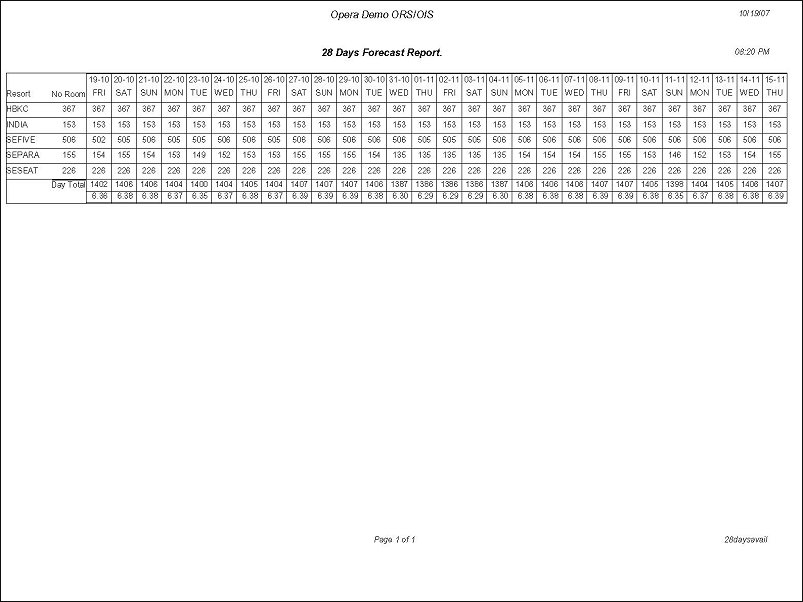 The 28 Days Forecast Report will display the number of scheduled bookings for all properties belonging to the central reservation office, for the selected 28 day time period. This report provides the opportunity to view room availability.