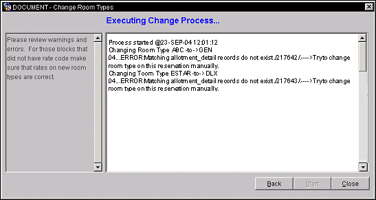 Following the actual error information is advice that the user may want to change the room type on the reservation manually. The user can make the requested fixes and this will insure that in-house and future reservations, blocks, and room number configurations have been successfully changed to the newly defined room types.
