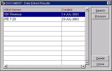 To create a new mail merge document or mail merge file, highlight an entry in the list and select the Process button. The Extract Results screen appears with the data extract query results you selected displayed.