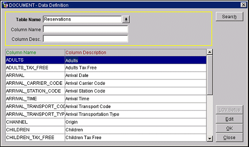 The Data Definition screen (Configuration>Setup>Data Definition) provides a useful resource for researching details about the data fields available in the OPERA database views and tables, without requiring extensive knowledge of database design. The information contained in the Data Definition screen can be useful when you are setting up a data extract for a mailing (Miscellaneous>Data Extraction), when you are setting up default field values for screens (Configuration>Setup>Screen Design>Field Defaults), or when attaching a user defined LOV group to a UDFC field that will be added by Screen Painting (see LOV Maintenance).
