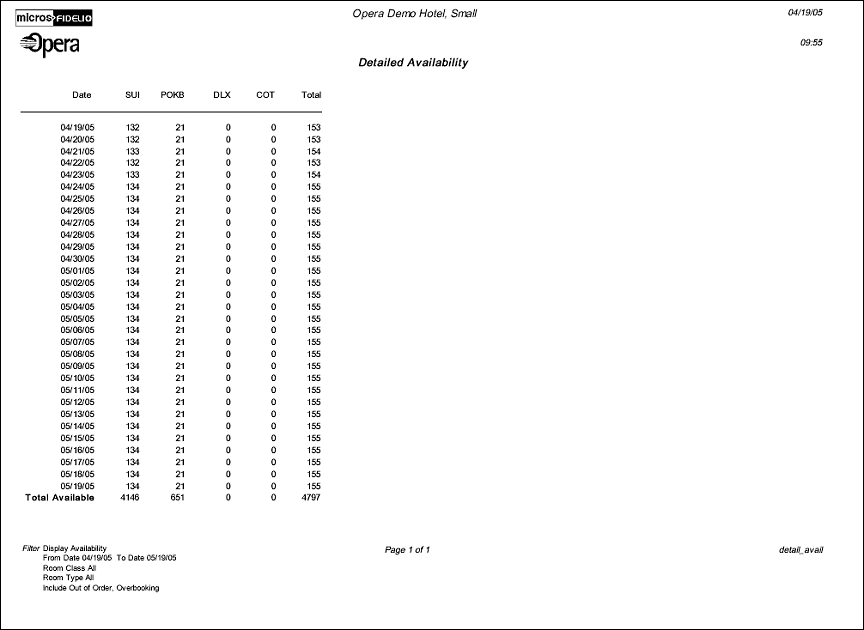 The Detailed Availability Report displays availability based on room types for a specified date range. The report can reflect either Availability or Occupancy. This information is pulled directly from the Detailed Availability screen (Ctrl+F2).