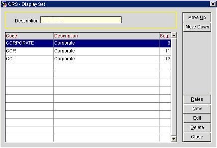 You can create display set codes so that a reservation agent can find rooms based on a special group rate such as corporate, discount, and promotional. The code you create here is available for selection in the rate code filter list found in the ORS Sales Screen (Rate Availability Screen). When the rate code filter (display set) is selected, only the rates that you have grouped within the display set rate code grouping are shown.