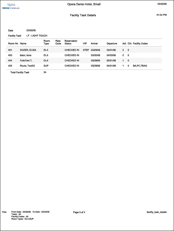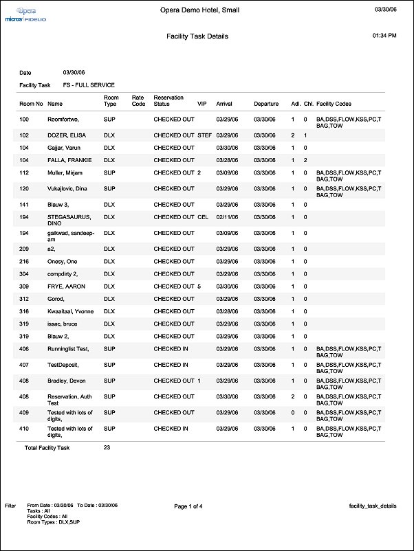In the report output, the results will be displayed in ascending order either by Room Number or Room Type. Then basic information about the reservation, including Guest Name, Reservation Status, VIP, Arrival Date, Departure Date, and the number of Adults and Children. Then in the last column, if any Facility Codes are attached to the Facility Task for the reservation, then these will all be displayed. If multiple tasks are assigned to a room, a single facility task will display by room number based upon priority.