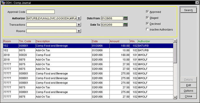 Note: When Staged is selected and Approved is not selected, the display shows both staged and non-approved transactions. Non-approved transactions are those that are neither staged, nor declined, nor approved.