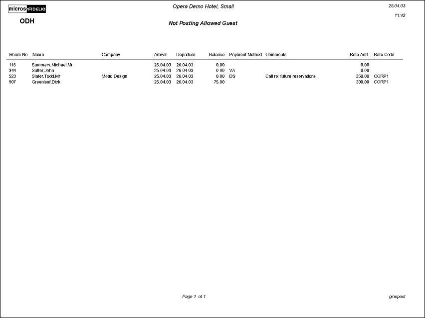 The Guests in House Not Posting Allowed Guests Report displays all checked in guests who have no posting privileges on their reservation. This is determined from the More Fields tab on the Reservation screen.