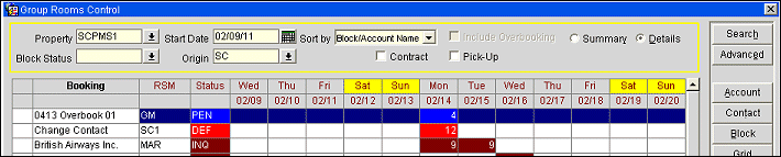 Summary. Show a summary by business block status of the rooms on the books for the date range specified in the grid.