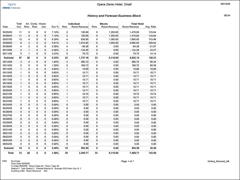 The History and Forecast Business Block Report gives you a clear picture of past reservation activity as well as what reservations are anticipated into the future, broken down into Individual versus Block Business. The report output is divided into Statistical data and Forecast data. The output will match that of the history_forecast.rep with a further additional breakdown of Revenues and Rooms.