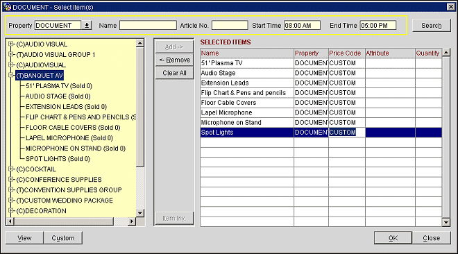 The value of creating Item templates is in adding them to Events. From the Event Search screen (Business Management>Events or select the Events button from the Business Block screen), search for the event you want to modify. Select the Resources button and the Event Resources screen displays. Select Item to display the Select Items screen.