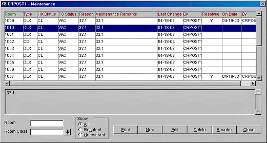 Show Resolved. View all maintenance requests that have been resolved. When a room maintenance request has been carried out, a Y marks the request as Resolved. If you find out later that the request has not been resolved highlight the request (the Resolved button now changes to Unresolved) and select the Unresolved key to mark the request as outstanding again.
