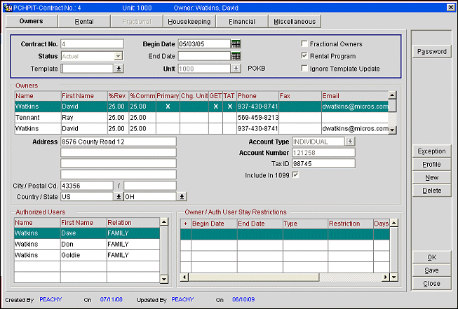 Authorized users are persons that have been granted permission from the owners to use the unit. This grid is hidden when the Ownership > Fractional Ownership application function is set to Y and the Fractional Ownership check box is selected. The Authorized Users for Fractional Owned units is found within the Fractional Tab of the contract.
