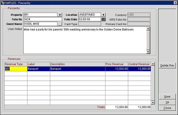 New. Select to enter passerby revenue. You will be directed to the Profile Search screen where you can enter a new profile name and select Search; highlight the desired profile and select OK. The Passerby screen appears (see below). Here you can create or delete revenue, create or delete a Membership Transaction, and add notes to the record.