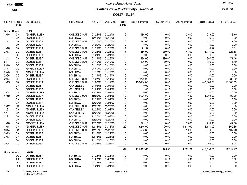 The Profile Productivity Statistics Detailed Report allows a means of printing a detailed breakdown of each reservation that comprised the production for a specific profile. The report may only be printed for one profile at a time.