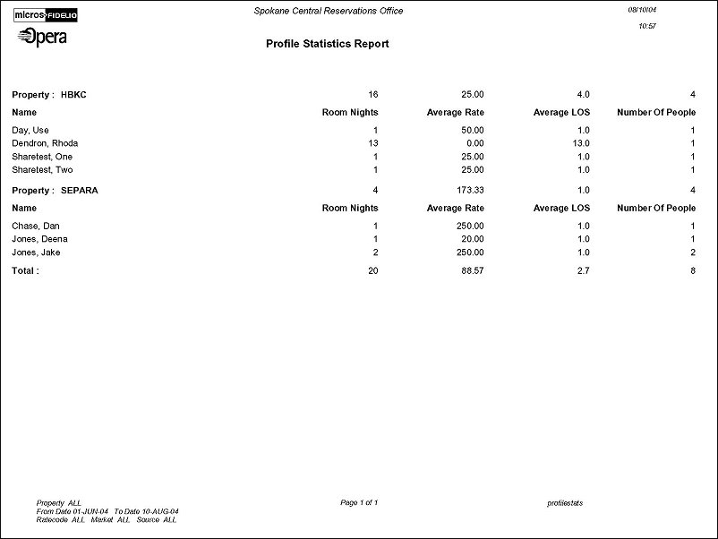 This report displays by profile with Room Nights, Avg. Rate, LOS (Length of Stay) and by number of People. The report is based on the Stay Data Analysis by Profile.
