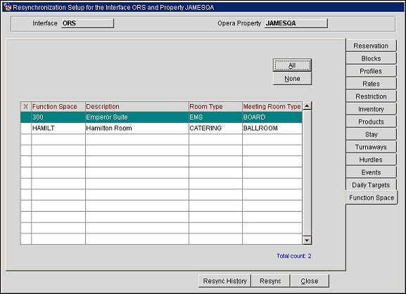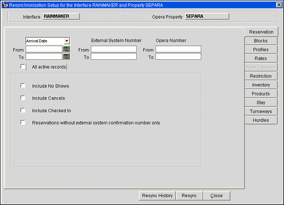 Generic Resync of Data to the External System at Any Time - The Resync options can be run individually and in no particular sequence at any time to resync specific data to the external system. One reason for this could be to send all reservations that have not received an external system number during the original transmission. It is recommended that reservations only be resynced once it is certain that the respective rate codes, blocks, and profiles have been built in the external system.