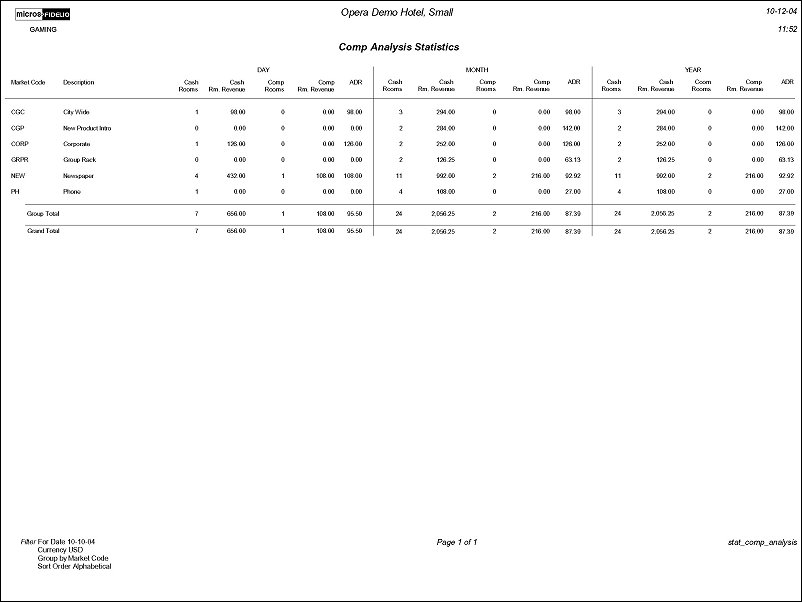 The Comp Analysis Statistics Report displays a breakdown of Cash Rooms, Cash Room Revenue, Comp Rooms, Comp Room Revenue and the Average Daily Rate (ADR). When the report is run, the  report output is divided into the three sections of Day, Month to Date, and Year to Date.