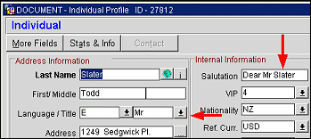 Each individual profile and contact profile contains a field for the person's Title (e.g., Mr, Mrs, Herr, Dr, etc.) on the Profile screen. The titles available when you select the Title field down arrow on the Profile screen depend on the language selected for the profile in the Language field. In other words, if you select E, for English, the available titles might be Mr, Mrs, or Ms. If you select F, for French, the available titles might be Mlle, Mm, or M. Additionally, when you select the title, a pre-configured default salutation for guests having that title appears in the Salutation field. For example, if you select the title "Mr" for Michael Summers, the default salutation might be "Dear Mr Summers." The default salutation can be edited for this profile directly in the Salutation field.