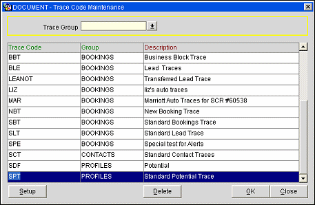 Select Trace Group. Pick the Trace Group for the Trace Code you want to see. Trace Groups are higher-level categories of Trace Codes.