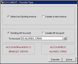 The Transfer Type screen allows for the ability to select an existing invoice or create a new invoice to transfer the transaction to. Once that is selected, then an existing AR Account will need to be selected or a new AR Account can be created.